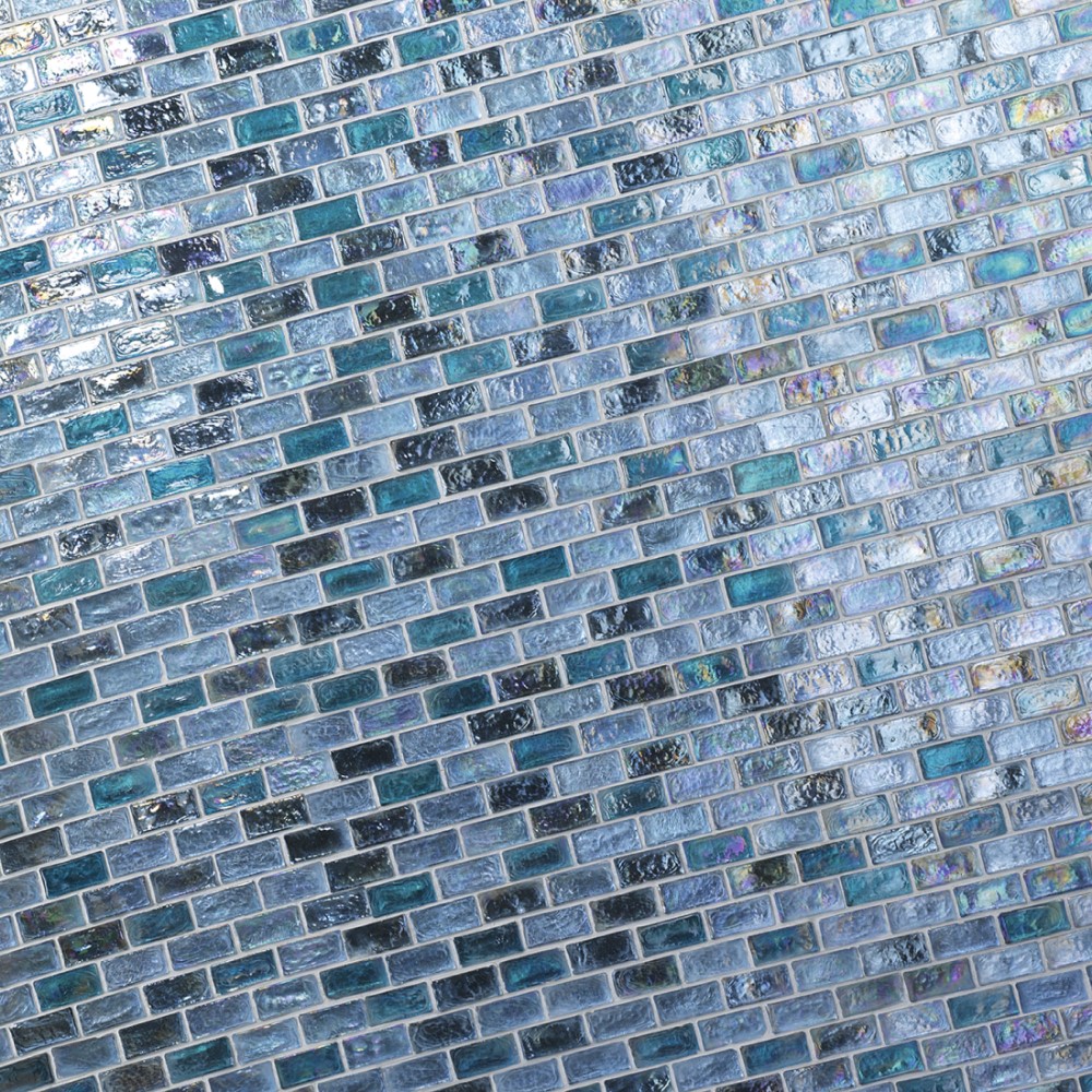 Мозаика из стекла с прямоугольными элементами и металлизированной отделкой и рельефом. Радужные тональности холодных тонов: синие и лиловые идеально подходят для оформлениея ванной комнаты.