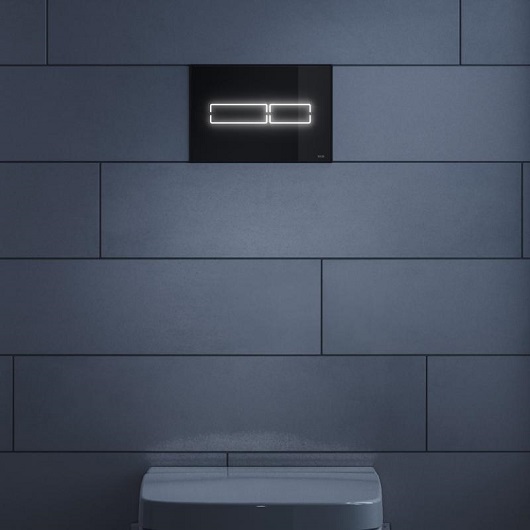 Датчик движения реагирует, когда человек приближается к унитазу и только тогда включает подсветку клавиш смыва. Управление смывом бесконтактное или простым касанием области клавиши.