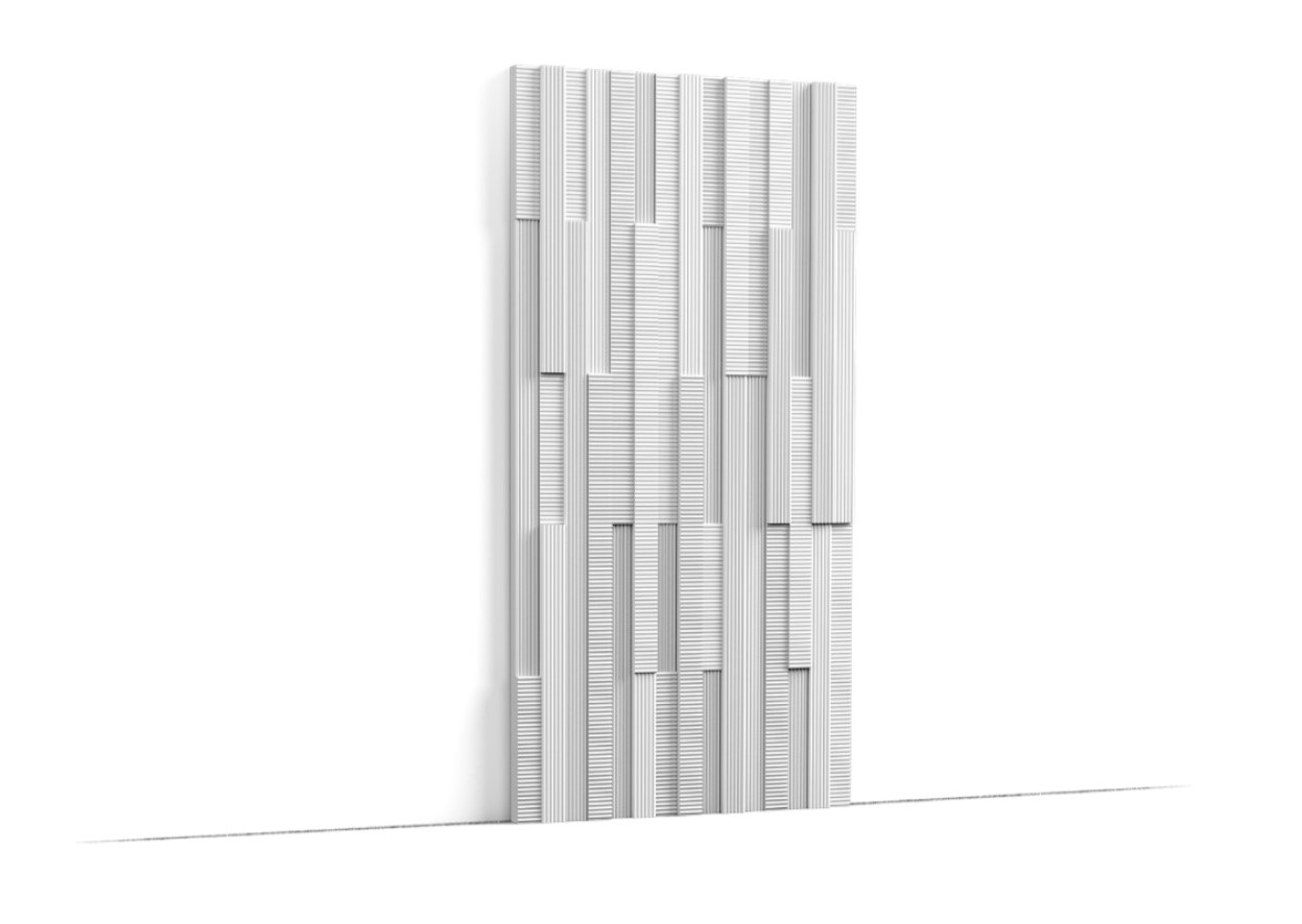 Ячеистая и многослойная форма рельефа панели W216 напоминает о цифровой реальности и пиксельной эстетике. Чередование средних и мелких элементов придает дизайну элегантную динамичность.