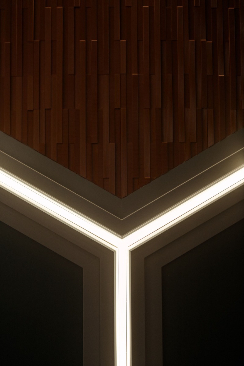 Эффектные панно из панелей с подсветкой каждый год становятся местом визуального притяжения стенда. На этот раз V-образную форму панно дополнила новинка W216 с фрагментарным дизайном.