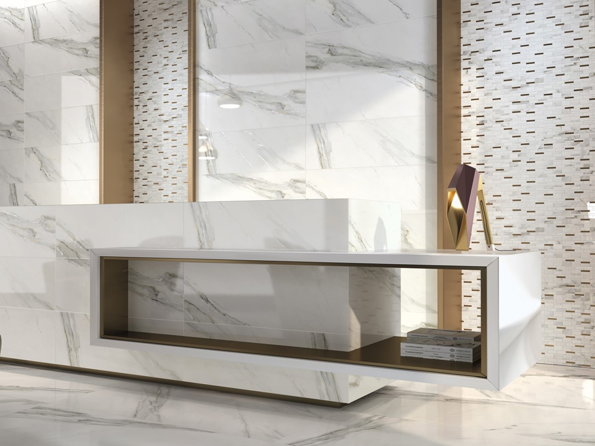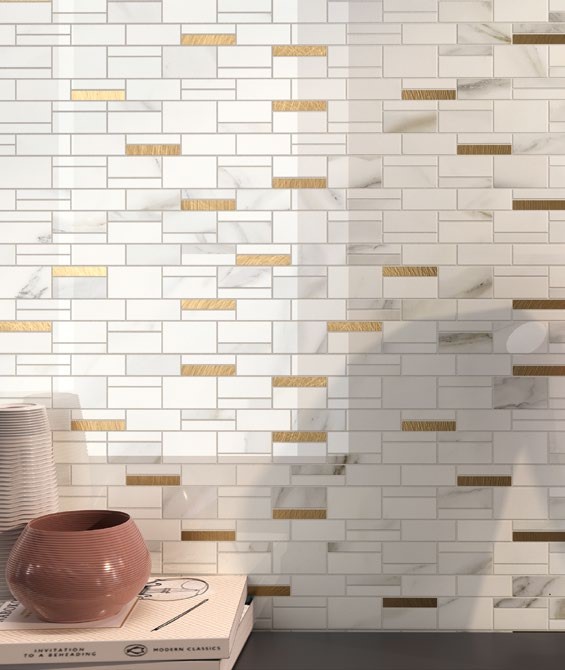 Мозаика сочетает камень с отделкой под мрамор «калакатта» и вставки из алюминия под золото.
