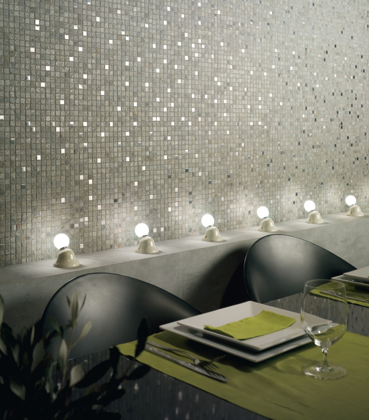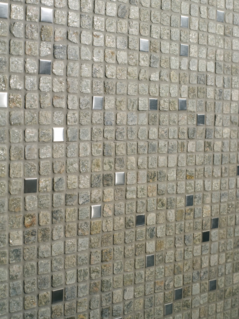 Мозаика из сероватого кварца со смальтами из нержавеющей стали.