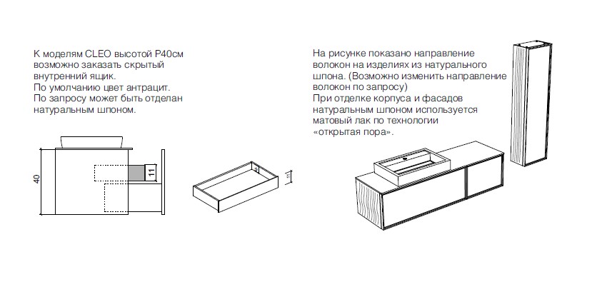 Корпуса тумб и пеналов Cleo покрыты эмалью или отделаны натуральным шпоном. Фасады выполняются из тонированного стекла, тонированного зеркала или рифленого крашеного стекла и обрамлены в алюминиевую раму с порошковой покраской.