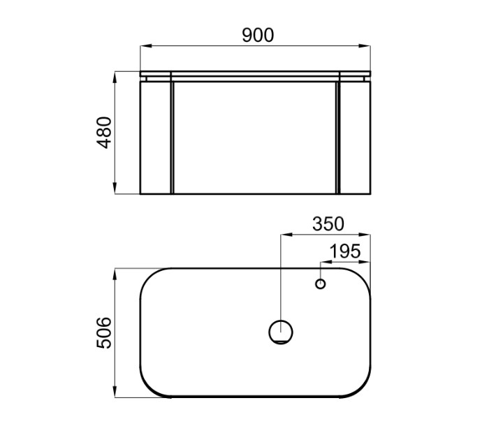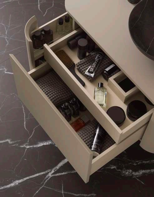 Подвесной модуль 90 см для раковины на столешницу. Наружная поверхность столешницы Project Tech. Включает центральный и внутренний ящики с доводчиками и два боковых ящика с полками и доводчиками.