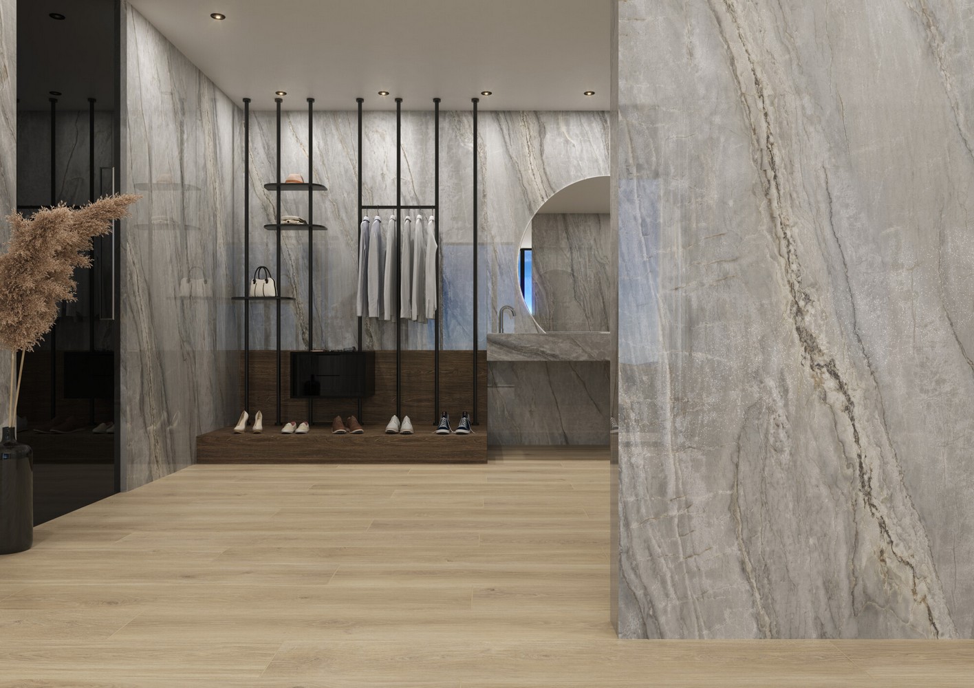 Эксклюзивное инновационное покрытие Premium Polished Shimmer создает на крупноформатной плитке переливающуюся полированную поверхность с эффектом взвешенных белых частиц, которая отличается выразительностью и элегантностью.