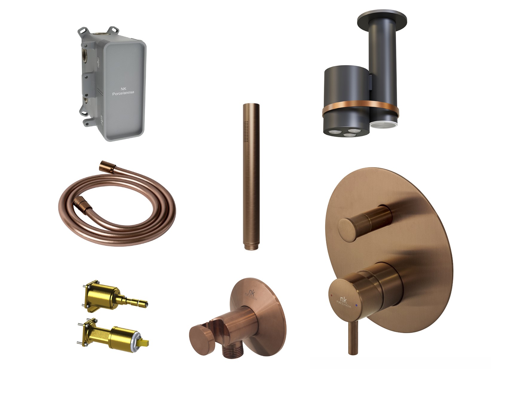 NOKEN PACK EYE Душевой комплект со смесителем, потолочной лейкой с хромотерапией, браш. медь