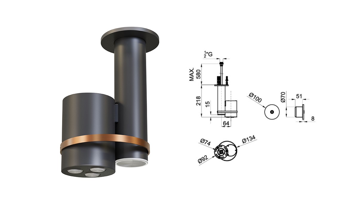 100361125 NOKEN EYE Потолочная душевая лейка с хромотерапиией, 100-240V, черный матовый/браш. медь