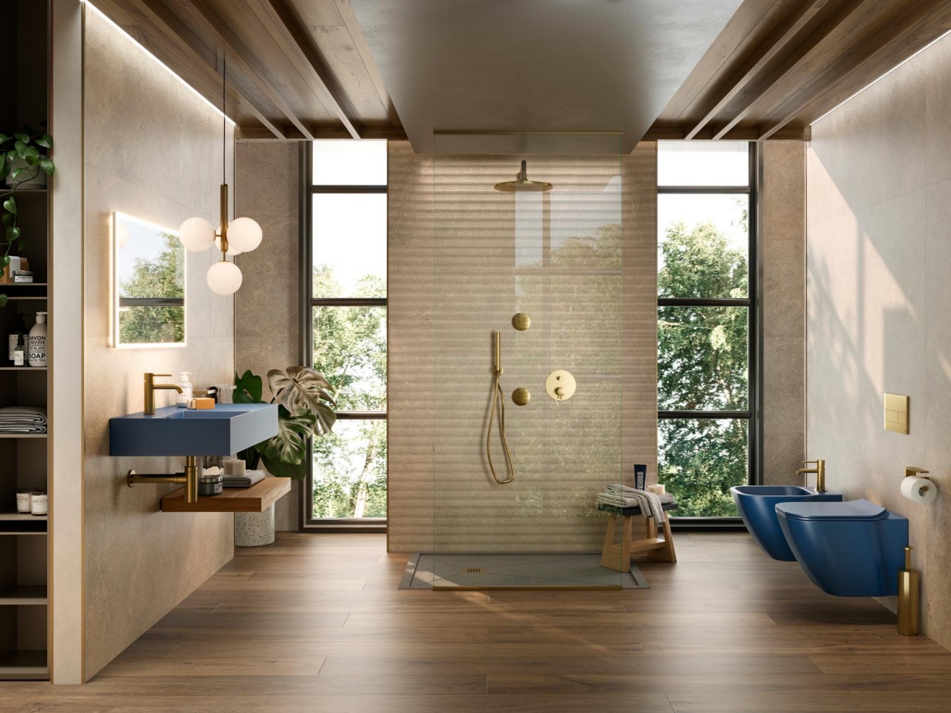 Главная / Каталог / Сантехника / Программа для ванны и душа / NOKEN PACK EYE Душевой комплект со смесителем, потолочной лейкой с хромотерапией, браш. золото