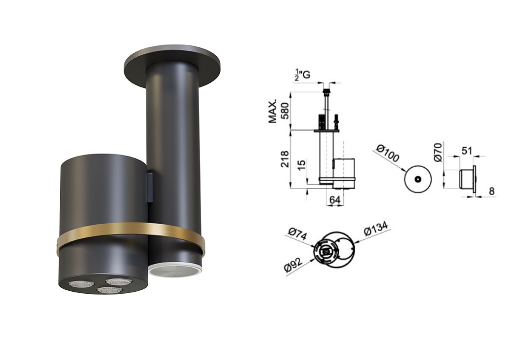 5) 100361124, NOKEN EYE Потолочная душевая лейка с хромотерапиией, 100-240V, черный матовый/браш. золото
