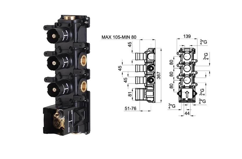 Внутренняя часть термостатического смесителя на 3 выхода. Подводы на 3/4. Ручка управления напора воды. Напор при 3-х атмосфер на 1 выход воды 36,5 Л/мин. На 2 выхода 39,5 Л/мин, при совмещённом открывание на каждый выход воды по 19,75 Л/мин. Обратный клапан воды и кнопка стоп на 38С.