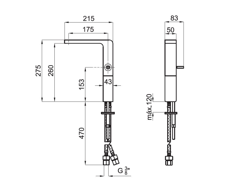 Однорычажный смеситель для раковины с высоким изливом и керамическим картриджем Ø25 мм. Связь 3/8”. Длина шлангов 470 мм, без клапана слива. Включает аэратор, внедренный в излив, который симулирует эффект падения воды каскадом, кроме того смеситель со стопором давления в 8 л/мин, чтобы предотвращать забрызгивание.