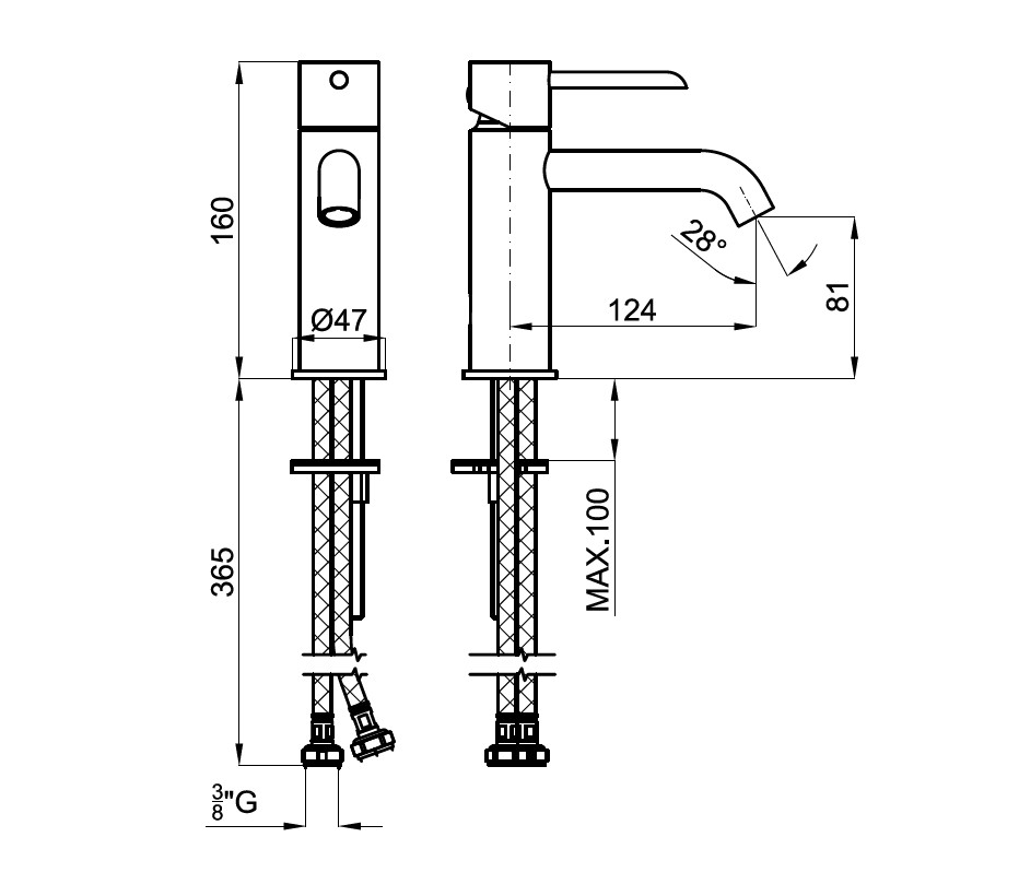 • Подключение 3/8”, длина шлангов 365 мм