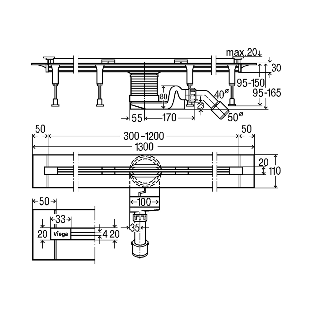 Длина: 300–1200 мм, Монтажная высота: 95–150 мм, Номинальный диаметр: 40/50