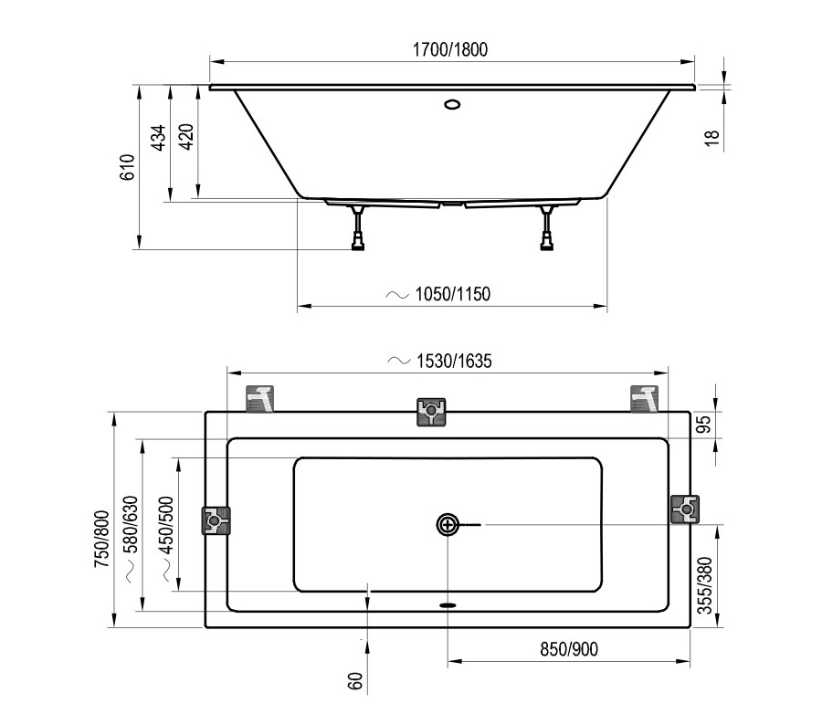 Допустимые отклонения по длине и ширине ванны составляют ± 5 мм
