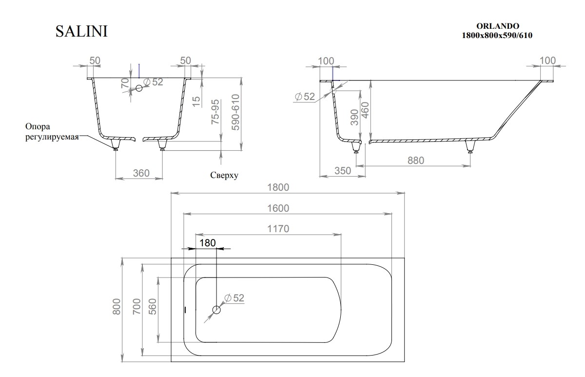 Главная / Каталог / Сантехника / Ванны / Salini ORLANDA 180 Ванна встраиваемая 1800х800х600 мм, S-Stone - белый матовый